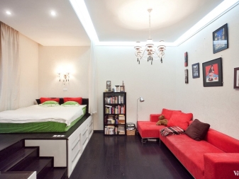 Ако височината на тавана достигне 3 м, разделянето на помещението може да бъде избегнато чрез инсталиране на легло или работна маса „на второ ниво“. Необичайно и практично решение би било да инсталирате издигащо се легло. Днес има много възможности за инсталиране на многостепенни мебели. Друга трудност при формирането на дизайна на едностаен апартамент може да бъде организацията на работната зона.. Удобен начин е да разширите перваза на прозореца и да инсталирате плота.