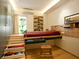 Всеки квадратен сантиметър е включен в този интериор. Подиумът наскоро стана широко разпространен в дизайна. Такива интересни дизайни ви позволяват да модифицирате пространството и да увеличите неговата полезна площ. Работният се намира в горната част на подиума и самият той действа като разтегателно легло. Благодарение на второто ниво, в космоса останалият ъгъл е отделен от общия обем на стаята.