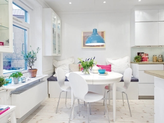 Масивни маси в малка всекидневна изглеждат обемисти. По -добре е да се даде предпочитание на опцията без ъгли, което позволява настаняване на повече хора. А тези, които рядко организират гала вечери, могат да заменят масата за хранене с масичка за кафе или работна маса.. Многофункционалните мебели са ключът към успеха в спестяването на пространство в малки пространства.