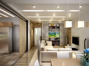 Добре обмислената система за осветление играе важна роля за създаването на комфорт. Светлината може значително да разшири пространството, което е безспорен плюс за малките стаи. Разрешено е използването на различни видове осветителни тела, ако те са хармонично интегрирани в интериора на интериора. Функционалността на отделните зони ще бъде подчертана от локалното осветление. Всяка зона има право да използва отделен тип осветление.