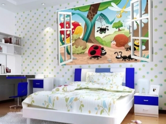 Декорирането на стените на залата с фреска или фототапет е добър вариант не само да увеличите обема на стаята, но и да добавите оригиналност и индивидуалност към стила. По -добре е да изберете перспективно изображение (мост, път в далечината или морски пейзаж). В детската стая, над яслите, можете да поставите образа на героите от приказките. Но не трябва да забравяме това трябва да се избягват твърде ярки цветове. Стенописи, изобразяващи небето, опънат таван в подобен диапазон ще добавят височина към стаята.