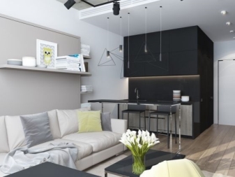 Отличителна черта на архитектурата на новите сгради е проектирането на студиа. Студиото е свободно пространство с кухня, влизаща в хола и отделна баня. Когато създавате дизайн за малък апартамент (например площ от 17 кв. М), е по -добре да дадете предпочитание на отворен план. Преходът от кухнята към хола трябва да бъде плавен. Когато планират стил в студио, дизайнерите се съветват да дадат предпочитание на вградените уреди, за да придадат на дома кокетност и да облекчат пространството..