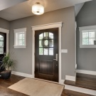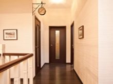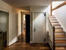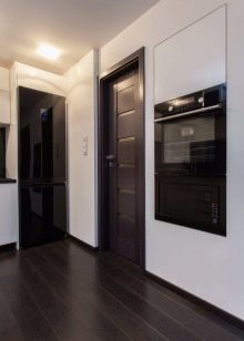 Този подход към интериорния дизайн е най -подходящ в онези помещения, където има много врати (например в коридора). Алтернативен вариант може да бъде рязък контраст: черните врати изглеждат стилно на фона на под, който е близо до нюанси на бяло или сиво. Изборът в полза на различни, но в същото време не контрастни цветове, се счита за безвкусен.