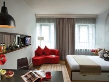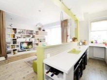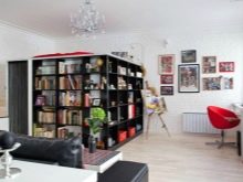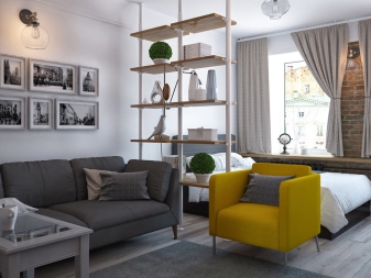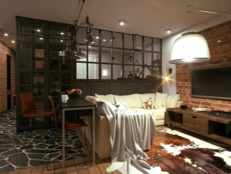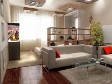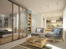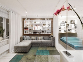 - Можете да превърнете една стая в спалня-хол с кухненска част, като използвате малка преграда, допълвайки интериора на спалното пространство с огледала и килими, декорирайки зоната за гости с ъглов диван и добавяйки индивидуално осветление към всяка функционална зона.