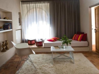 - За да зонирате малко пространство на обикновена стая, имате нужда от подиум. Пухкав матрак, няколко декоративни възглавници и акценти в кубчета в същия цвят като възглавниците ще създадат неописуема атмосфера на домашен уют.
