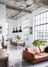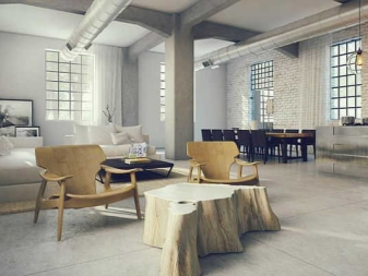 - използване на умишлено груби елементи в интериорната декорация (необмазани стени, кафяви и сиви цветове, абстрактни картини, бетонни повърхности).