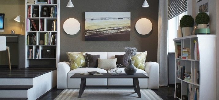 - Можете да ограничите пространството на стая със стелаж и диван едновременно, разделяйки зоните за спане и гостите с тях, докато за по -голям контраст можете да използвате различни модели лампи и килими, като не забравяте да комбинирате детайлите на обзавеждане със същата форма на декор и подобни нюанси на цветовата палитра.