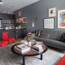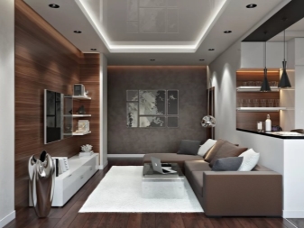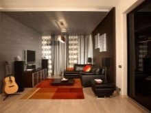 - една стая е запазена за зоната за гости, допълнена от аудио и видео система с акустика. Ограничете пространството с различни облицовки на стени (например, подчертавайки зоната, където се намира диванът);