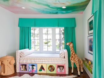 Декорациите на зоната на тавана изглеждат добре в детската стая: рисувана картина, лека композиция от различни лампи или ефект на много нива, при който таванът има необичаен модел, образуван от релеф и различни нива на височина. Всяко от тези нива е подчертано от прожектори, които допълват централното осветление..
