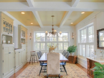 В просторна трапезария таванът може да има различни прегради-греди, чрез които визуално разделя стаята на трапезария и зона за готвене.