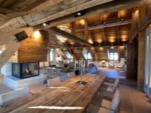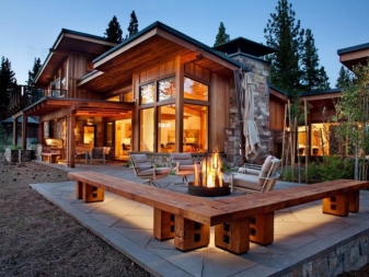 Формат хижа, той е „ловен дом“ – произхожда от швейцарските и австрийските планини. Огнището се превръща в сърцевината на дизайна, който е поставен или до най -дългата стена в хола, или в средата на стаята. Идеалната подова настилка е дъска с матов или полуматов ефект, умишлено състарена, същото изискване важи и за плочките. Не забравяйте да помислите за мерките за пожарна безопасност, като поставите открита камина в дървено жилище, особено близо до стените.