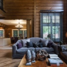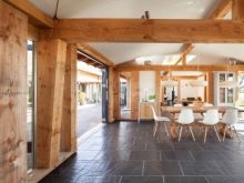 Комбинация от заоблени огледални повърхности помага да се премахне усещането за празни стени. Той също така допринася за визуалното разбиване на линейния модел на трупите, става истинска декорация на интериора. Високите тавани са се превърнали от недостатък в достойнство, като са инсталирали голям екран за проектор там. Аквариумът, изложен в разделящата ги преграда, спомогна за увеличаване на осветеността на трапезарията и хола. Дори в малка дървена къща банята изглежда красива, завършена вместо обичайните плочки с естествена шисти.