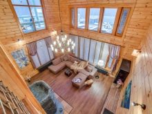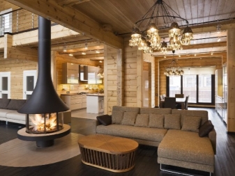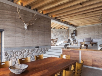 В случая на двуетажни къщи се създават оптимални условия за формиране на интериора под хижата. Първият етаж обикновено е от тухли или се използва естествен камък, а вторият е от дървен материал.. Този подход се характеризира и с: