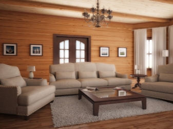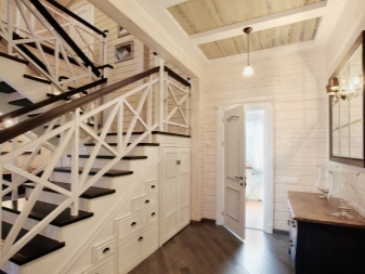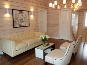 Имитация на панелни врати, направени до цялата височина на стената и допълнени от корниз, ще направят атмосферата по -жива и свежа. Това решение се счита за универсално, но по принцип декорацията на дома от профилирани или залепени греди трябва да се извършва в съответствие с основния стил..