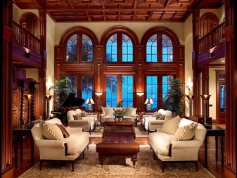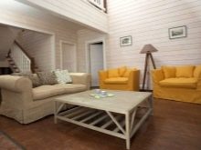 Професионалните декоратори знаят как да направят това, така че при пълно съответствие с каноните сградата да стане свежа и индивидуална. Често оригиналността се придава чрез промяна на външния вид на огнището, използването на антични мебели в трапезарията и стъклена врата се изработва по поръчка. Препоръчително е да декорирате спални на втория етаж възможно най -различни един от друг, да използвате не само контрастни цветове, но различни части от гамата. Преградите ще ви помогнат да разделите стаята визуално на определени части по ваша преценка.