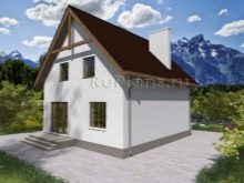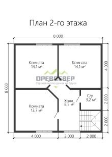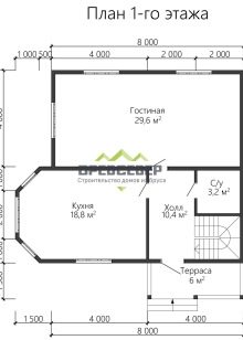 Дървена къща с размер 8х8 м може да има и еркер. На приземния етаж на сградата има хол с размери 29,6 кв. м. Размерите на кухнята достигат 18,8 м2. Има баня, тераса, коридор и дори втора светлина. На горния етаж 3 стаи, антре и резервна баня.