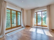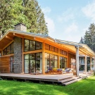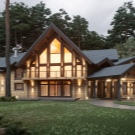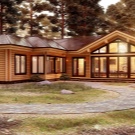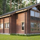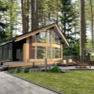 - Лепен ламиниран дървен материал също се е доказал като материал за създаване на едноетажни къщи, където могат да се монтират панорамни прозорци. Той има точни геометрични размери, което позволява структурата да бъде силно устойчива на външни фактори и да поддържа топлоизолация. Лесната инсталация дава възможност за ускоряване на изграждането на конструкция, за разлика от тухлените или бетонните конструкции. Сред многото проекти се откроява къща с високи тавани и панорамни прозорци с площ от 85 м2.