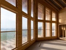 Необходимо е да се вземат предвид характеристиките на дървения материал, за да бъде готов за правилното свиване у дома.. Също така трябва внимателно да изчислите местоположението на помещенията, където ще има фасада с голяма площ на остъкляване, и да изберете рационално материали. Конструкцията трябва да има необходимото ниво на топлопреминаване и звукоизолация. Тези характеристики трябва да присъстват в изчислението на архитекта, което ще позволи да се избере правилната дебелина на стъклените елементи и основните параметри на профила на прозоречната конструкция..