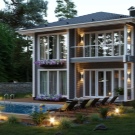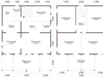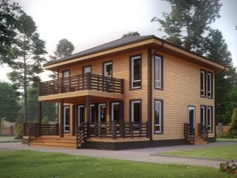 Проектите на двуетажни къщи с панорамно остъкляване са по-сложни от проектите на съвременните вили. Разработването на такива планове се извършва от професионални архитекти, които имат богат опит в тази област. Например, двуетажна къща, изработена от дървен материал 9 на 9, има два входа, тераса с балкон и много просторни стаи, които могат да настанят семейство от 5-9 души. Самостоятелното изграждане ще отнеме поне 5 години, а закупуването на материали ще изисква големи разходи, компанията предлага да извърши работа в рамките на 900 хиляди рубли за кратко време.