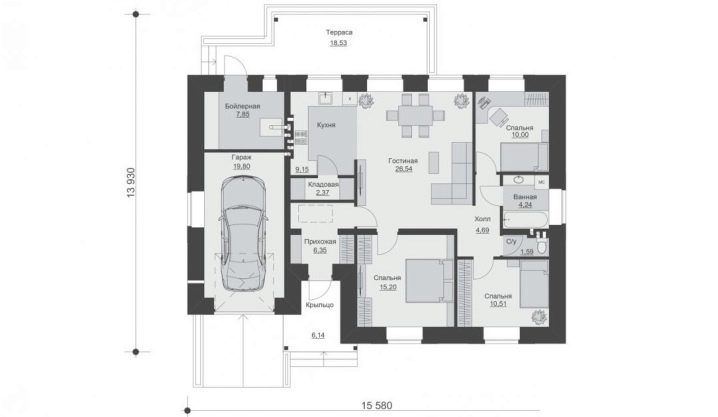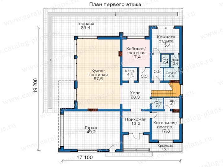 Домовете с панорамни прозорци могат да бъдат много привлекателни. Една от тези опции включва тераса с размери 89,4 кв. м. Има и гараж с площ от 49 м2. Размерът на кухня-хол достига 67,6 кв. м. Освен това на първо ниво идентифицирахме: