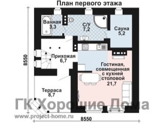 Двуетажната къща може да бъде допълнена със сауна. В този случай холът се комбинира с трапезарията и кухнята..