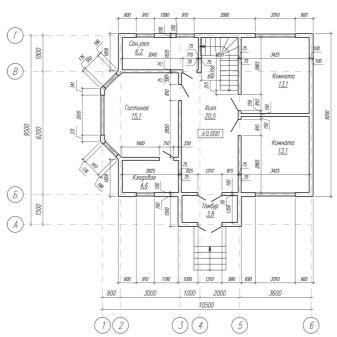 - Всекидневна с еркерен прозорец – 15,1 м2, баня – 6,2, две спални – по 13,1 всяка, антре – 20,5, вестибюл – 3,8, килер – 4,6. Тамбурът стърчи напред, сякаш образува веранда, но всъщност е затворено пространство. Втори етаж: оформлението като цяло е запазено, тъй като трябва да повтаря долния етаж, само че вместо втория хол има още една спалня. Втората зала е намалена на 11,1 м, а част от нея е предоставена на спалнята – 11,4 м2.