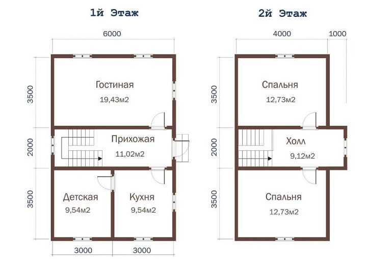 - Приземен етаж: хол – 19.43, антре – 11.02, кухня и трапезария (или детска стая) – по 9.54 м всеки Второ: антре – 9.12, спалня – 12.73 м2.