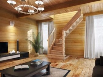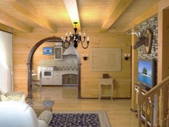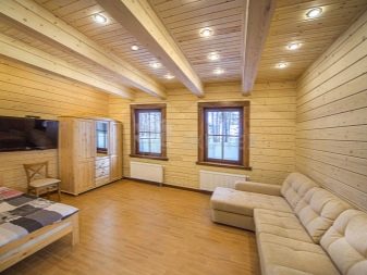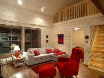 Логично е да се проектират тавани в такива сгради с помощта на греди, но можете да направите и версия от гипсокартон. Дървените дъски, обработени с лак, ще изглеждат подходящи на пода, но можете да поставите ламинат или паркет.