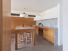 - Модерни. В дървена къща кухнята може да бъде декорирана в този интересен стил. Модерният се характеризира с нестандартни линии декор и мебели. Препоръчва се интериорната декорация да се повери в този дух на опитни дизайнери..