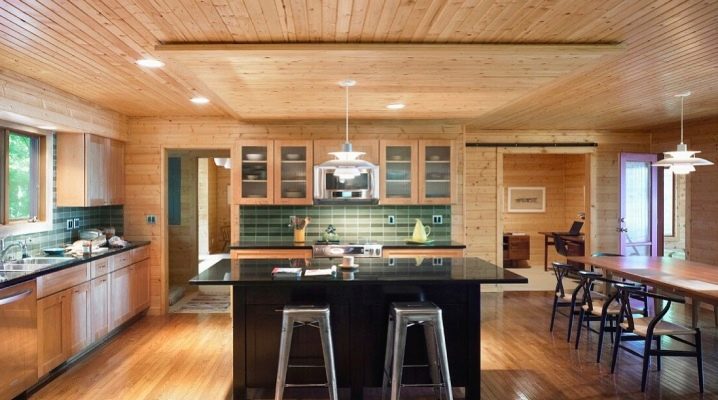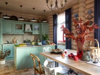 Вместо пълноценни слушалки е позволено да се монтират прости висящи рафтове и отделен шкаф с мивка. Във вътрешността на кухнята на дървена къща обикновено се намира маса с квадратна или правоъгълна конструкция. Препоръчително е да подредите столове с облегалки. При желание собствениците имат право да правят само с няколко табуретки..