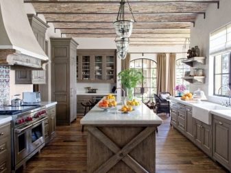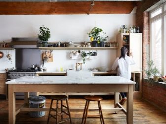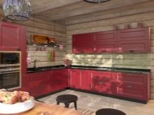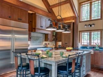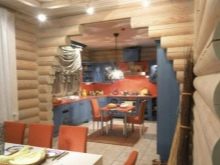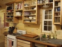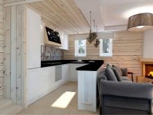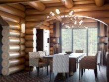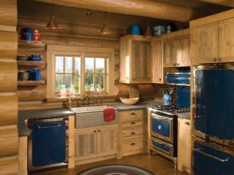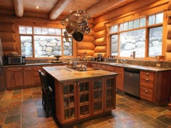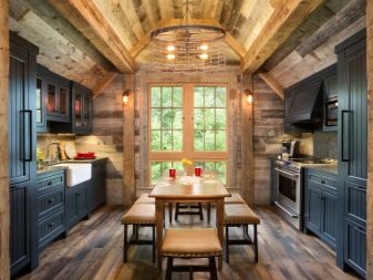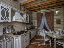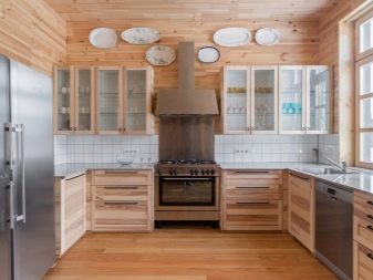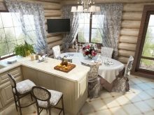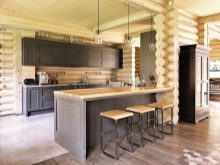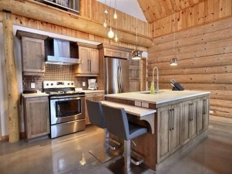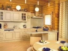 Вместо пълноценни слушалки е позволено да се монтират прости висящи рафтове и отделен шкаф с мивка. Във вътрешността на кухнята на дървена къща обикновено се намира маса с квадратна или правоъгълна конструкция. Препоръчително е да подредите столове с облегалки. При желание собствениците имат право да правят само с няколко табуретки..