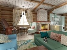 - Кънтри, прованс, шаби шик. Селските дестинации са най -подходящи за къща от дървен материал. В такива стилове довършването, мазилката е по избор. Можете просто да обработите дървото със защитни импрегнации. В разглежданите посоки дървените мебели изглеждат хармонично. Дизайнът може да има остарели повърхности и дори кракелурен ефект (типично за стила на шаби шик). Необходимо е да изберете подходящи текстилни елементи: завеси, салфетки, покривки. Бели, пастелни, карирани опции ще са подходящи..