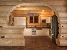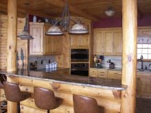 - В жилищни сгради от заоблен дървен материал кухните изглеждат великолепно, проектирани в различни стилове. Не само селски кънтри, но и френски, дори някои модерни стилове ще се впишат органично тук..