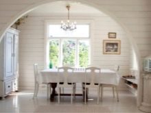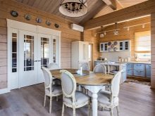 - Класически кухненски комплект в обикновен бял цвят ще изглежда лесно и уютно в жилище от дървени трупи.. Масата и столовете, разположени отстрани на работната зона, също могат да бъдат снежнобели. Препоръчително е да инсталирате много осветителни тела в такава среда, използвайте светло покритие на пода..