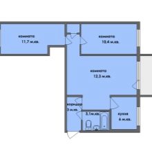 Жилището с три стаи може да има и ъглово разположение. В този случай една от стаите се превръща в обиколка и обикновено се превръща в хол. В този случай такъв апартамент често се преустройва. Често в нови къщи помещенията се отдават под наем без прегради, осигурявайки на бъдещите собственици просторни студия с последващото планиране на такива жилища по тяхна преценка.
