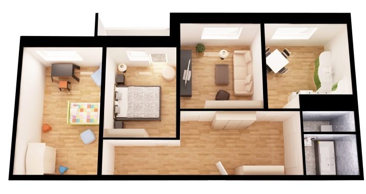 В тристайните жилища предназначението на всяка стая зависи от броя на хората в семейството и от условията на работа на всяка от тях. Ако един от членовете на семейството работи у дома, тогава в този случай такова жилище не може да се направи без проучване. Размерите на тристайни жилищни помещения могат да варират от 56 до 80 квадратни метра или повече. Малък апартамент заема 60-63 м2.