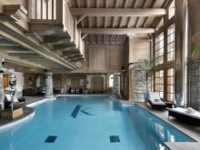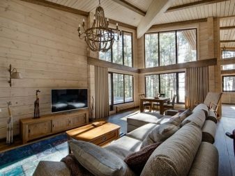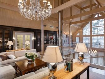 Модерни дървени къщи от втората светлина могат да бъдат направени във всеки стил – руски, финландски, норвежки, хижи и други. Снимката показва методите на организиране на двустепенно осветление в церемониалните дворцови зали, конни арени. Без такива решения по принцип е невъзможно да се организират спортни комплекси с басейни, фитнес клубове.