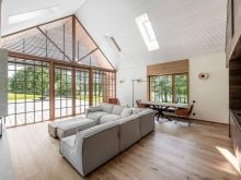 - Следваща проба направена в имение, което позволява използването на просторна двуетажна къща от мансарден тип като жилище за няколко поколения. Терасата с барбекю, разположена пред входната група, е украсена с необичайни масивни колони, изработени от мощни стволове от вековна иглолистна дървесина. Панорамното остъкляване и големите прозорци осигуряват максимална естествена светлина.