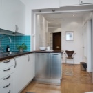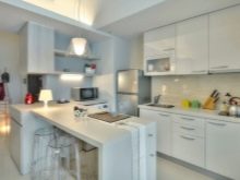 Ако имате студио апартамент, тогава кухненската зона може да се извади малко в пътеката, като по този начин се разшири престилката с помощта на лек стъклен бар брояч. Така че можете да направите зониране и да организирате удобно място за хранене..