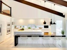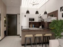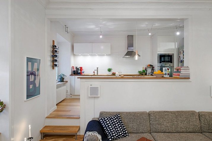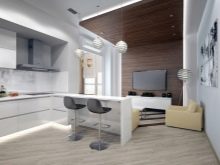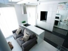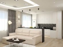 Комбинираното пространство на едностаен апартамент винаги предполага зониране. На първо място се решава въпросът как да се отдели кухненската зона, ако е студио апартамент. За да разрешите този проблем, можете да използвате зониране с многостепенен таван или подове с множество нива. В допълнение, идеалният вариант за разграничаване на кухнята и дневната е монтаж на висок бар брояч и бар столове от двете страни на кухнята. Можете да поставите маса за хранене на пътеката, ако не харесвате бар плота.