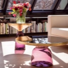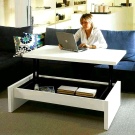Диван, удобно разположен близо до нея, дори ще ви позволи да седнете на масата, да се обърнете към него и да работите. Освен това в него ще се настанят удобно всички необходими неща: книги, дистанционно управление на телевизора и други предмети. След като премахнете всички тези неща, можете да вечеряте с тях. Предоставете в такава таблица раздел за съхранение на вино и други бутилки.