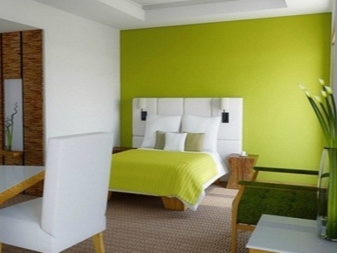 При подреждането на едностаен апартамент все пак по -добре е да използвате по -спокойни и светли цветове, но ако искате да направите модерен акцент, тогава можете да използвате такъв стилен вариант: украсяваме една стена с ярък цвят, например светлозелен, и я украсяваме с обемни дървени тапицерии. В същото време мебелите трябва да бъдат прости и незабележими..