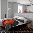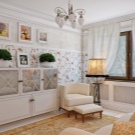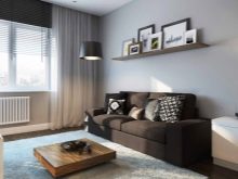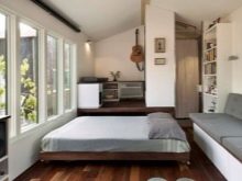 В този случай мебелите често се използват под формата на обикновен обикновен сив или бежов диван, мини шкафове, гардероб с огледални врати и класическо легло с вградени чекмеджета. Мебелите трябва преди всичко да изпълняват функционална роля и едва след това декоративна. По -добре е да замените завесите на прозорците с модерни щори или светли завеси. Можете да направите няколко ярки цветни акцента под формата на столове, пулове или възглавници на леглото..