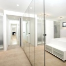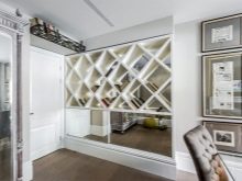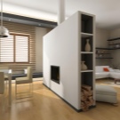 За апартамент тип студио дизайнерите предлагат интересен и функционален ход, като фалшива стена. Може да се инсталира в средата на стаята. По -добре е, ако в него има огледало или прозорец. Така тя ще се превърне в бариера на входа на стаята и ще скрие някои части от стаята от любопитни погледи. Но в същото време няма да стесни стаята, тъй като няма да бъде плътна или огледална. Освен това зад такава стена можете да подредите маса за хранене или да оборудвате работно място.