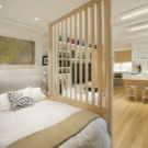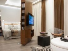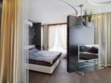 По -трудно е зонирането за да се отдели зоната за спане. За това е по -добре да използвате опции за твърди дялове. В този случай можете да направите сгъваем екран, преградна стена или да окачите завеси. Преградите могат да бъдат плетени, тъкани и дори дървени. В някои случаи е възможно да се инсталира полупрозрачна стелажна конструкция.