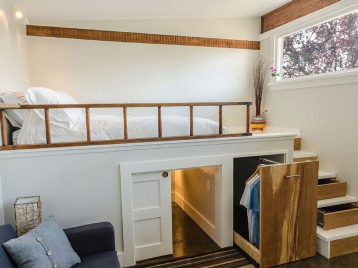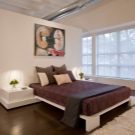 Нощната зона може да бъде отделена с дялове под формата на стъпка. Той ще бъде кратък, но ще може да скрие нивото на леглото. Изглежда по -лек и по -сложен..