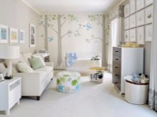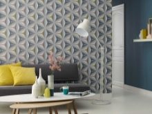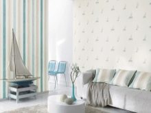 Що се отнася до щампи, в този случай надлъжната ивица или мекият цветен печат са идеални. Стенните покрития също могат да имат морски или абстракционни шарки. По -добре, ако го направят универсален и не блестящ.