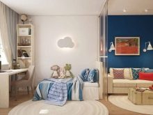 Но когато детето вече е пораснало, по -добре е да му се отдели по -голяма зона за спане, отделно от родителите му и да се оборудва допълнителна зона за игра там. В този случай е по -добре да използвате екран или дял. Някой трябва да се побере в едностаен апартамент дори не с едно дете, а с няколко. След това при планирането трябва да се отдели повече място за зона за деца. Зоната за разделяне може да се превърне в жилищна зона, която плавно ще се влее в спалнята..