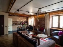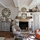 За декорация се използват тухли и естествен камък, но са подходящи и материали, които имитират тези покрития. В такава стая се прави бар брояч. В допълнение, масичка за кафе или скрин могат да бъдат заменени с ракла и дори куфар..
