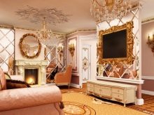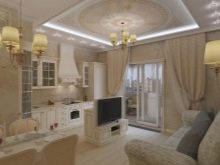 В центъра на стаята трябва да закачите елегантен полилей с кристални или стъклени елементи. По -добре е да използвате многоетажен таван. Такъв интериор е чудесен вариант за малки апартаменти, но с високи тавани и широки прозорци..